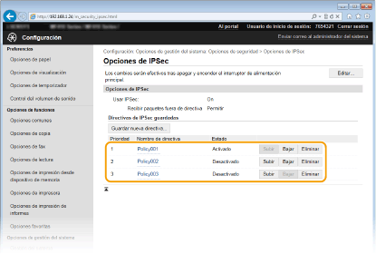Uso del panel de controlTambién podrá activar o desactivar la comunicación IPSec desde <Menú> en la pantalla Inicio. Usar IPSec