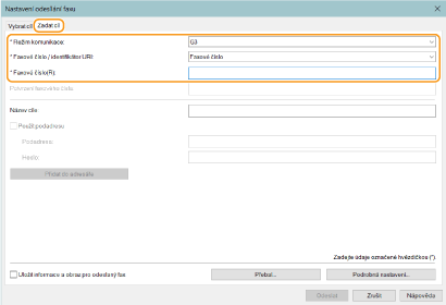Klikněte na kartu [Zadat cíl] a zadejte používaný režim komunikace a faxové číslo.