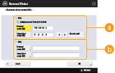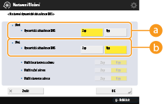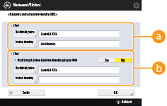 Chcete-li nastavit, aby hostitelské jméno a jméno domény bylo stejné jako IPv4, stiskněte <Zap> v <Použít stejné jméno hostitele/domény jako pro IPv4>. Chcete-li nastavit, aby jména byla odlišná od IPv4, stiskněte <Vyp>.
