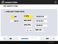 Chcete-li nastavit IP adresu ručně, zrušte výběr pro <DHCP> nebo <Auto IP> stiskněte <IP adresa>, <Maska podsítě> a <Adresa brány> a zadejte jednotlivé hodnoty a stiskněte <Další> nebo <OK>.