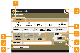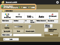 Zde se zobrazuje stav nastavení, např. rozlišení, zvětšení/zmenšení a velikost skenování. V zájmu správného naskenování dokumentů nastavení vždy zkontrolujte. Chcete-li nastavení změnit, stiskněte tlačítko pod zobrazením. Další informace o typech souborů viz