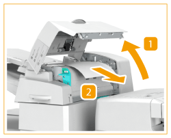 Část doplňku Document Insertion Unit-N může při odstraňování papíru zachyceného ve finišeru zčásti překážet. Jednotku vkládání dokumentů nejprve nadzdvihněte a teprve poté začněte odstraňovat papír zachycený ve finišeru.