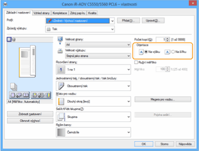 Na obrazovce [Basic Settings] ovladače nastavte položku [Orientace] na stejnou orientaci, jakou jste nastavili v kroku 1.