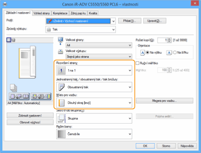 [Pořadí stránek] [Jednostranný tisk/oboustranný tisk/tisk brožury] [Místo pro vazbu].