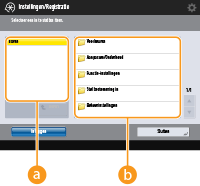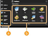 (Instellingen/Registratie) om het scherm <Instellingen/Registratie> weer te geven. Druk eerst op deze toets om wijzigingen aan te brengen voor elke instelling, zoals papier-, weergave- en netwerkinstellingen. Op dit scherm kunt u ook bestemmingen opslaan, zoals e-mailadressen n faxnummers.