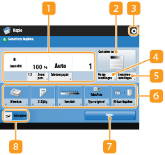 Geeft instellingenstatus weer, zoals zoompercentage, papierformaat en aantal kopieën. Controleer de instellingen om goed te kunnen kopiëren. Om de instellingen te wijzigen, drukt u op de knop onder het weergavegedeelte.