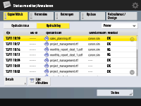 (Status monitor/Annuleren) drukt, wordt het scherm Status monitor/Annuleren weergegeven, waarin u de verbruiksgeschiedenis kunt controleren voor elke functie zoals kopiëren, afdrukken, e-mail verzenden, faxen/I-faxen verzenden/ontvangen, bestanden opslaan in ''Geavanceerde ruimte'', enz. Vanuit dit scherm kunt u ook de gebruiksgeschiedenis voor elke functie afdrukken.