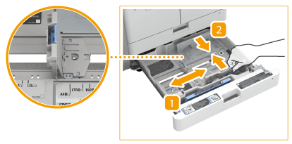 Pressione a parte superior da guia frontal e, ao mesmo tempo, deslize-a até alinhar com o indicador de formato do papel que será colocado.