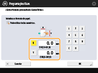 Pode gravar até cinco tipos de papel de formato livre utilizados frequentemente. Os formatos de papel gravados aqui são apresentados no ecrã de seleção do formato de papel para a gaveta para papel e para o tabuleiro multifunções (Especificar o formato e o tipo de papel no deck/gaveta para papel ou Especificar o formato e o tipo de papel no tabuleiro multifunções).