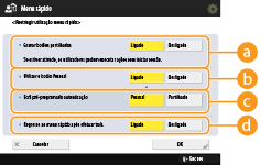 Se o programar para <Ligado>, o Menu rápido é apresentado depois de executar um trabalho. Se o programar como <Desligado>, a função utilizada antes de executar um trabalho é novamente apresentada.
