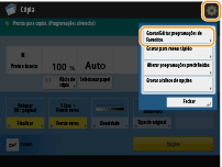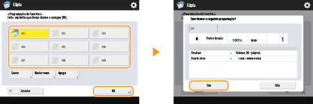 As programações de cópia em cascata guardadas em <Progr. anteriores> ou <Prog. de Favoritos> são substituídas pelas programações de cópia local quando a máquina ou a impressora de cópia em cascata é reiniciada. Se quiser chamar <Progr. anteriores> e efetuar cópias em cascata, ligue a impressora e atualize as informações sobre a impressora de cópia em cascata decorrido o tempo programado em <Tempo de espera para ligação no arranque>. <Intervalo p/transmissão cópia em cascata>