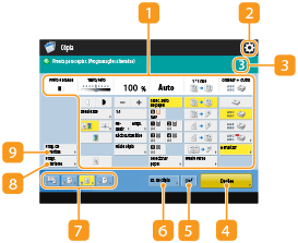 Apresenta o estado das programações, como o rácio de cópia, o formato de papel, o número de cópias, etc. Certifique-se de que confirma as programações aqui para fazer cópias corretamente. Para alterar as programações, carregue no botão sob a secção de apresentação. Operações básicas de cópia
