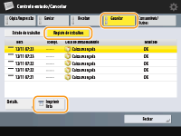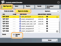 (Controlo estado/Cancelar), aparece o ecrã Controlo Estado/Cancelar, que permite verificar o histórico de utilização de cada função como, por exemplo, copiar, imprimir, enviar correio eletrónico, enviar/receber faxes/I-faxes, armazenar ficheiros em "Caixa avançada", etc. A partir deste ecrã, também pode imprimir o histórico de utilização de cada função.