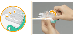 Introduza a patilha que está na extremidade da caixa de agrafos na cartridge de agrafos e baixe a caixa de agrafos para encaixá-la.
