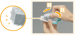 Aperte as marcas de seta na caixa de agrafos e retire-a na direção da seta.