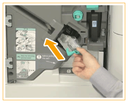 Siga o procedimento descrito nesta secção para substituir a caixa de agrafos no agrafador para a unidade opcional Staple Finisher-V/Booklet Finisher-V.