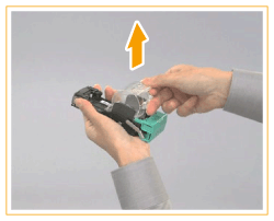 Segure na patilha verde da cartridge de agrafos e puxe-a diretamente para fora na sua direção.