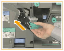 Siga o procedimento descrito nesta secção para substituir a caixa de agrafos no agrafador para a unidade opcional Staple Finisher-X/Booklet Finisher-X.