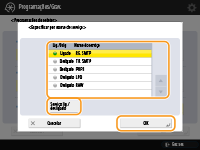 Carregue em <Especificar por nome de serviço> para utilizar nomes de serviço quando especificar as portas às quais o IPSec se aplica. Selecione o serviço na lista, carregue em <Serviço lig./desligado> para o programar para <Ligado> e carregue em <OK>.