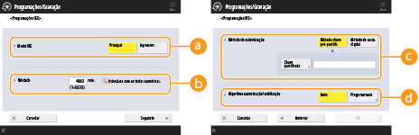 Selecione <Auto> ou <Progs manuais> para programar como especificar o algoritmo de autenticação e codificação para o IKE fase 1. Se selecionar <Auto>, é programado automaticamente um algoritmo que pode ser utilizado tanto por esta máquina como pelo par de comunicação. Se pretender especificar um determinado algoritmo, selecione <Progs manuais> e configure as programações abaixo.
