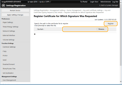 Clique em [Browse...], especifique o ficheiro (certificado) que pretende gravar e clique em [Register].