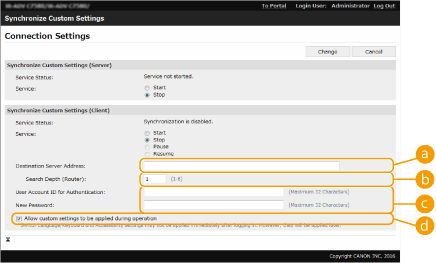 Para utilizar a máquina como máquina cliente/servidor, selecione [Start] para [Service] em [Synchronize Custom Settings (Server)] e em [Synchronize Custom Settings (Client)].