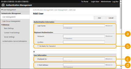 Também pode registar informações do utilizador carregando em  (Programações/Gravação)  <Progs de gestão>  <Gestão do utilizador>  <Gestão de autenticação>  <Gravar/Editar utilizador autentic.>. <Gravar/Editar utilizador autentic.>