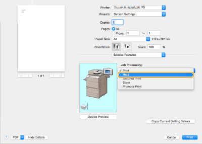 Selecione [Hold] em [Job Processing] no painel [Special Features].