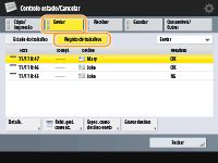 Especificar/registrar destinos a partir do histórico de envioPode especificar destinos e registrar destinos no livro de endereços a partir do histórico de envio no ecrã <Controlo estado/Cancelar>. Este procedimento poupa o trabalho de introduzir o endereço diretamente e também ajuda a evitar o envio para um destino incorreto devido à introdução do endereço errado.