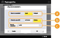 A comunidade exclusiva é uma comunidade (grupo) preparada para gestores que utilizem software da Canon como, por exemplo, iW Management Console. Para utilizar a comunidade exclusiva, carregue em <Prog. comun. dedicada.>. Para especificar uma comunidade geral, carregue em <Prog. nome comunidade 1> ou em <Prog. nome comunidade 2>.
