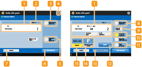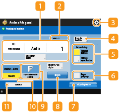 Apresenta o estado das programações como o formato do papel onde pretende imprimir e o número de impressões. Não se esqueça de confirmar as programações para uma impressão correta. Para alterar as programações, carregue no botão sob a secção de apresentação. Para alterar o número de impressões, introduza o número pretendido utilizando as teclas numéricas.