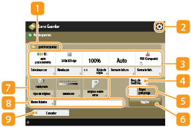 Quando carrega em <Ler e Guardar> no ecrã <Menu principal> e depois carrega em <Caixa de correio>, <Caixa avançada>, <Rede>, ou <Suporte de memória> para ler os originais, é apresentado o seguinte ecrã de programações.