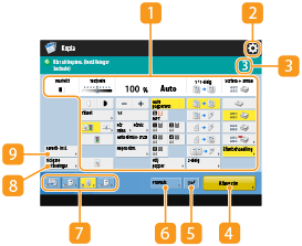 Visar inställningsstatus, t.ex. för reproförhållande, pappersformat, antal kopior osv. Kom ihåg att kontrollera inställningarna här för att kopiera på rätt sätt. För att ändra inställningarna, tryck på knappen under skärmbildsdelen. Grundläggande kopieringsfunktioner