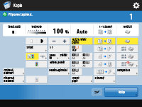 Zde se zobrazuje stav nastavení, např. poměr kopírování, velikost papíru, počet kopií atd. V zájmu správného zhotovení kopií nastavení zde vždy zkontrolujte. Chcete-li nastavení změnit, stiskněte tlačítko pod zobrazením.
