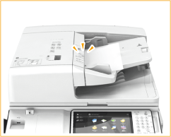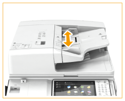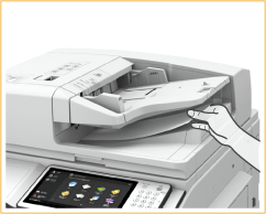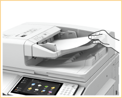 Ved placering af dokumenter i stort format skal du trække forlængeren til forsyningsbakken til dokumenter og forlængeren til originalbakken ud, så de ikke falder ud over kanten på fremføreren.