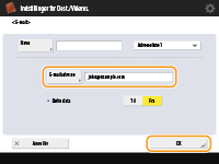 Når det anvendte domæne rettes, kan du springe domæneposten over. Du kan registrere et domænenavn til <Auto tilføjelse af angivet domæne til dest. u/domæne> og aktivere <Ved afsendelse af I-fax> på forhånd for automatisk at tilføje et domæne ved afsendelse uden at skulle skrive "@" og domænenavnet.