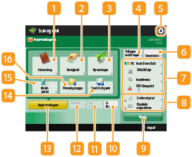 Viser indstillingsstatus, som f.eks. opløsningen og filformater. Sørg for at tjekke indstillingerne for at scanne korrekt. For at ændre indstillingerne skal du trykke på den ønskede knap.