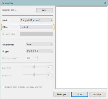 Hvis du altid scanner med de samme indstillinger, kan du følge procedurerne herunder for at registrere indstillingerne. Du kan nemt og praktisk hente dem, når du scanner. Vælg [Tilføj profil] på dropdown-listen [Profil]  Angiv de scanningsindstillinger, du vil registrere  Indtast et navn i tekstfeltet [Profilnavn]  Klik på [Gem profil]