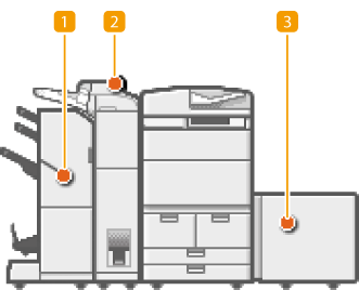 Hvis der opstår et papirstop under printning, mens hæftningsenheden er i brug, må du ikke fjerne papir fra andre steder end de placeringer, der er vist på touchpanelet. Hvis der f.eks. opstår et papirstop i hovedenheden, er det ikke nødvendigt at fjerne papir fra finisheren, hvor der ikke opstod et papirstop. Når du har ryddet papirstoppet i hovedenheden, bliver papir inde i finisheren hæftet fortløbende.