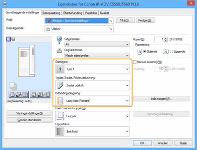 [Siderækkefølge] [1-sidet/2-sidet/Folderudskrivning] [Indbindingsplacering].