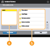 (Asetukset/Tallennus), niin <Asetukset/Tallennus>-näyttö avautuu. Paina ensin tätä painiketta, kun haluat tehdä muutoksia eri asetuksiin, kuten paperiasetuksiin, näyttöasetuksiin ja verkkoasetuksiin. Tässä ikkunassa voit myös tallentaa vastaanottajia, kuten sähköpostiosoitteita ja faksinumeroita.