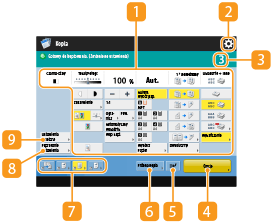 Wyświetla status ustawień, takich jak proporcja kopiowania, format papieru, liczba kopii itd. Aby kopiować prawidłowo należy te ustawienia potwierdzić. Aby zmienić ustawienia, należy nacisnąć na przycisk znajdujący się pod wyświetlaną sekcją.