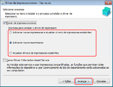 [Processo para instalar o driver de impressora]: selecione este se necessário, se um driver já foi instalado.