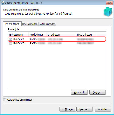 Hvis du vil ændre navnet på enheden eller indstille den som standardenheden, skal du markere afkrydsningsfeltet [Vælg printeroplysninger] → klik på [Næste].