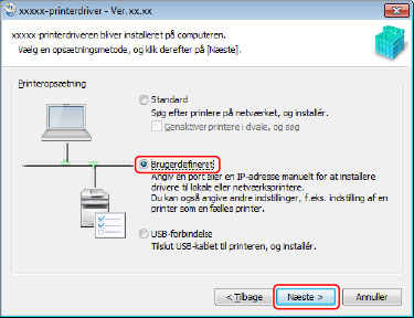 Vælg [Brugerdefineret] → klik på [Næste] i den viste meddelelse.