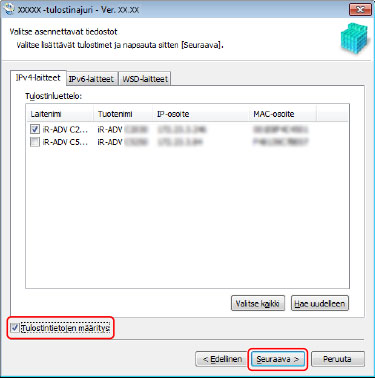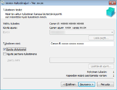 Jos haluat muuttaa laitteen nimeä tai asettaa sen oletuslaitteeksi, valitse [Tulostintietojen määritys] → valitse [Seuraava].