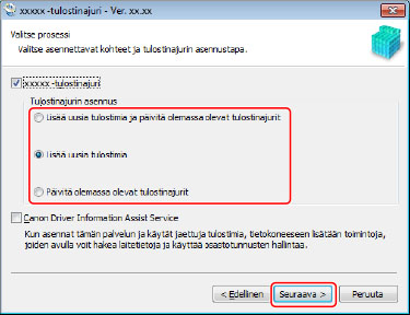 [Tulostinajurin asennus]: Valitse tämä tarvittaessa, jos ajuri on jo asennettu.