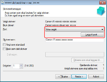 Hvis du la til eller har valgt en port for nettverksskriver, kan du ikke angi [Skrivernavn] og [Bruk som delt skriver].