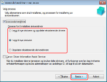 [Prosess for å installere skriverdriver]: Velg denne hvis det er nødvendig hvis det allerede er installert en driver.