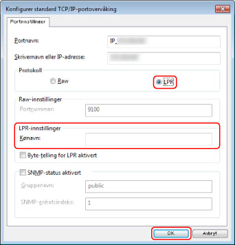 (1) Velg [LPR] for [Protokoll] → spesifiser én av skriverkøene for [Kønavn] i [LPR-innstillinger].